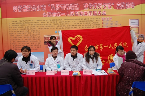 名医护人员代表参加了启动仪式。启动仪式结束后,省领导及合肥市和省直有关部门负责同志深入到和平广场学雷锋活动现场,亲切看望慰问了学雷锋志愿服务点的志愿者。我院组织了阵容庞大的义诊小分队,现场为广大市民提供义诊服务。虽然当天寒风瑟瑟,天空还飘着小雨,和平广场上却熙熙攘攘。参加义诊的医护人员也忘掉了寒冷和饥饿,耐心接待每一位应诊者,对他们进行精心的检查和诊断,用实际行动倡导文明新风,服务人民群众,把雷锋精神发扬光大。