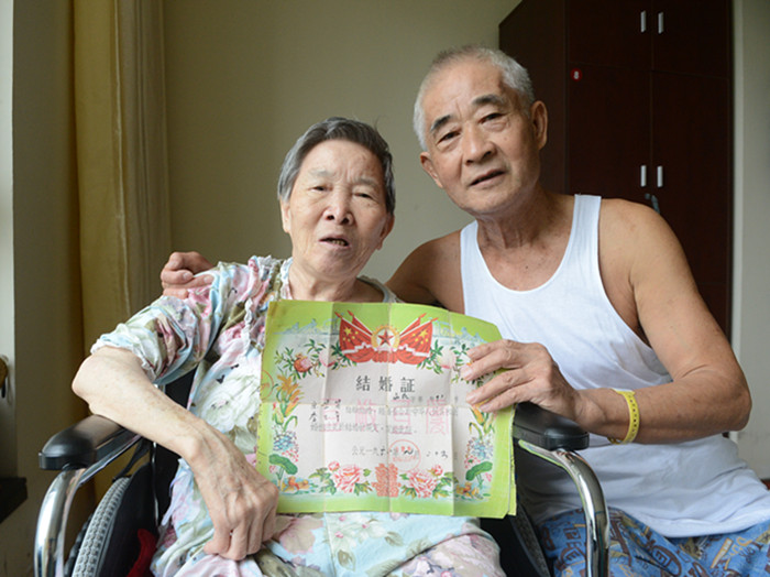 点,工作人员将宋兰芳的婚纱摆放到病床前,宋兰芳有些难以自持的激动,频频用手擦去眼角的泪。“别哭嘛,今天这样的好日子怎么哭了呢?”老伴季玉平握着宋兰芳的手说道。为了今天这个时刻,老伴季玉平早上