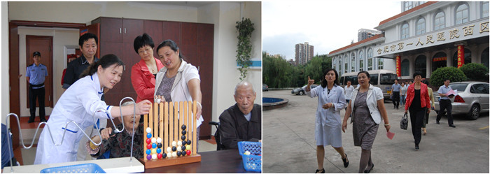 调研组一行首先来到集团西区老年护理养生院,参观了医养结合病房和即将投入使用的家庭式养老病房,奚主席详细询问了病房运行状况、收费及医保报销情况等。随后,调研组一行赶到合肥市滨湖医院,在内科五楼就老年科的病房规模、住院人数、收费情况等进行了实地调研。