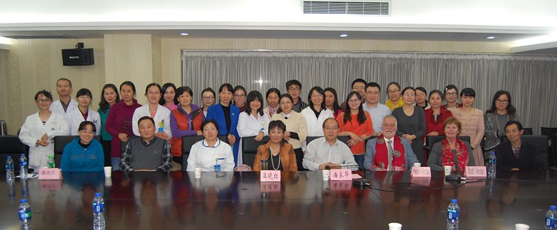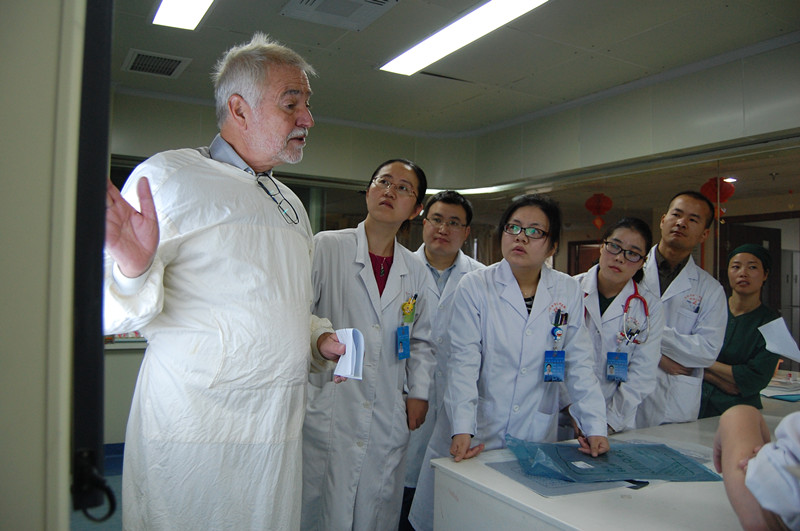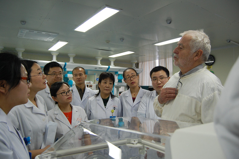 日上午Verder教授在新生儿重症监护病房(NICU)进行教学查房,查看了2例极低出生体重儿。管床医生汇报完病人的诊断及治疗过程后,Verder教授对患儿的管理给予了高度的赞扬。NICU的新生儿医生就早产儿管理中的常见问题如用氧、呼吸机使用、抗生素使用、激素使用、PICC置管、合理检查及发育性支持护理等问题与教授做了深入探讨,教授给大家提了许多宝贵的建设性意见。查房结束后大家都争先恐后与教授夫妇合影留念,医院NICU这个团队的合作和钻研精神给Verder教授留下了深刻印象,教授依依不舍离开了NICU。