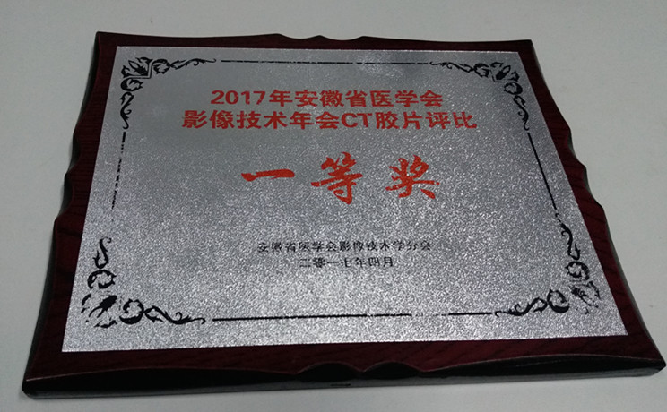 滨湖医院影像中心CT放射科技术组是一个以年轻人为主的队伍,在科主任的支持下,自开诊以来,技术组认真做好影像技术的传帮带工作,积极参加省内外学术活动,定期开展科内业务学习和考核,坚持不懈做好质量控制工作。继2015年获全国DR摄影大赛荣获二等奖、2016年全省DR摄影大赛荣获二等奖,今年再次荣获2017年安徽省医学会影像技术年会CT胶片评比“一等奖”。