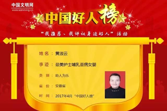 5月4日下午,中央文明办发布4月“中国好人榜”,合肥市“最美护士”黄淑云当选助人为乐类“中国好人”。截至目前,全市共130人当选“中国好人”,位居全国省会城市第二。