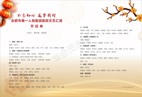 2019年1月5日下午,由院工会主办的“不忘初心 追梦前行”合肥市第一人民集团医院新年文艺汇演在滨湖医院16楼会议室隆重举行,集团医院党委领导班子、各科室主任和护士长、各行政职能部门职工们共同观看了表演。