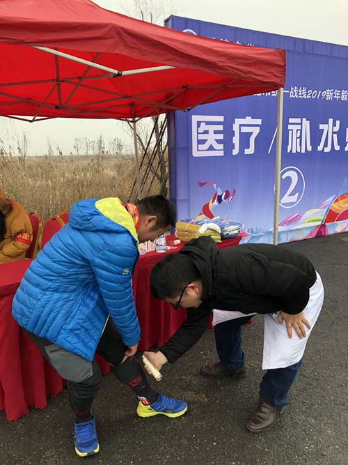 在温度只有1℃的户外环境下,陈飞和张颖即使身着羽绒服,也仍然是冻得鼻尖通红、鼻涕直流,但是两人仍然坚守在自己的岗位上,除了处理伤情外,还不忘给队员鼓气、助威,顺利地完成了第二组的新年毅行保障工作。