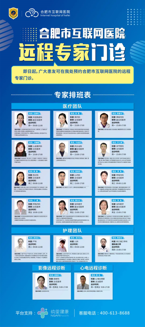 我院根据基层患者需求首批上线呼吸内科、心内科、神经内科、关节骨科、肾内科及全科医学专家,同时结合目前母婴及婴幼儿健康问题需求,上线了产科护理专家及儿科护理专家。新兴的医疗形式、多元化的服务场景、全方位的业态态流程,将进一步满足患者需求。