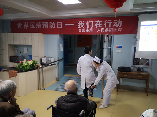 为进一步提高压疮患者的生活质量,为压疮患者及家属提供全方位的健康指导,为了更好地预防压疮。11月14日“世界压疮预防日——我们在行动”主题活动,在合肥市第一人民集团医院西区体保老年科举行。本次活动由集团医院伤口专业组成员志愿者及体保老年科同事共同组织,伤口中心王胜琴护士长及周桂花护士长参与策划。