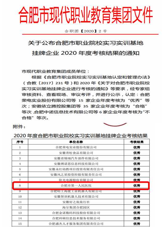 2020年10月,我院作为合肥市现代职业教育集团职业院校实习实训基地挂牌企业,护理部作为牵头部门,根据《合肥市职业院校实习实训基地挂牌企业考核表》的指标体系,认真组织准备考核佐证资料上报至合肥市现代职业教育集团,并参加现场答辩,顺利通过2020年合肥市现代职业教育集团挂牌企业考核,获得考核“优秀”,并获得市财政30万项目建设资金。