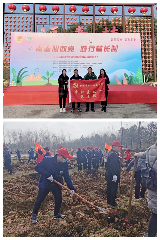 我院本部医技一支部受邀加入了该项活动,植树现场支部书记秦侃同志带头挥锹,铲土、扶苗、培土,栽下第一棵小杉树苗。到场的一支部党员同志们也纷纷加入植树的队伍,做到了劲往一处使,汗往一处流,整个过程认真细致,井井有条。大家都在用自己的劳动诠释着对大自然生命的关爱,整个活动现场热火朝天。众人拾柴火焰高,众人植树树成林。经过一个多小时的奋战,一排新栽的树苗在春风里昂然挺立,焕发出勃勃生机。
