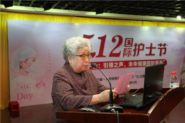 护理前辈、85岁的朱美娟主任讲话