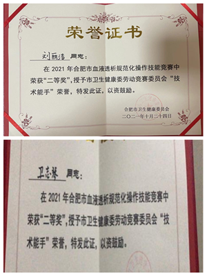 我院选派选手参加本次比赛并获奖,在全市同行面前的展示了透析规范化操作技能,也得到合肥市肾病学质量控制中心对我院血液净化中心护理质量的充分认可。医院血液净化中心将再接再厉,努力为每一位透析患者提供更优质、规范化的护理服务!