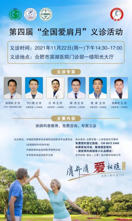 慢性肩关节疼痛已成为继慢性头痛、慢性腰痛之后的第三大疼痛,约有80%的成年人都曾有过不同程度的肩痛经历。作为一种常见病,它却往往容易被忽视或误诊,从而延误治疗,导致病情加重。为深入落实“健康中国”战略,提升我国群众对肩关节疾病的认知,规范诊疗,由中国医药教育协会肩肘运动医学专业委员会(全国肩肘外科协作组)中国医师协会运动医学医师分会、中华医学会运动医疗分会主办,北京大学第三医院、上海华山医院联合全国各地多家医院携手举办的第四届“全国爱肩月义诊活动将于2021年11月5日正式启动。
