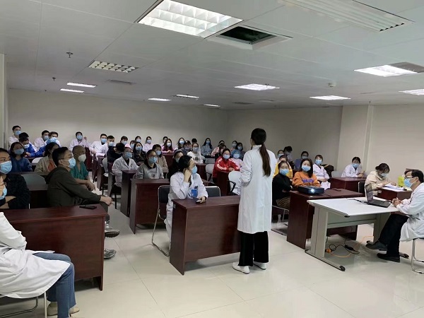根据皖疫防办[2021]488号文件《关于转发发热门诊设置管理规范》、《新冠肺炎定点医院设置管理规范》的通知要求,发热门诊所有工作人员须经穿脱防护用品,手卫生等知识和技能考核合格后上岗。针对此要求,医院高度重视,认真组织,院医务、护理、院感等多部门联合,在医院临床技能培训中心开展发热门诊上岗人员全员培训,包括医疗、护理、检验、药房、放射、财务、核酸采样、护工等岗位人员。感染科主任梁利民首先解读第八版疫情防控内容的诊疗具体要求。护士长陈莉莉对发热门诊管理要求规范、工作要求注意事项、生活区管理细节等要求进行培训,同时针对发热门诊现在运行的工作状态请大家提出建议。院感科从专业角度对穿脱防护服流程、手卫生、院感标准预防等给予科学规范的培训和解读。