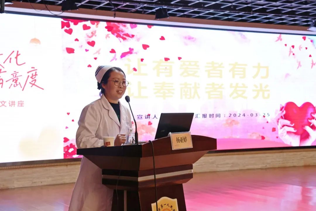 杨亚婷护士长以《让有爱者有力 让奉献者发光》为主题,结合自身经历讲述了志愿者的发展历史及社会意义。志愿者精神是奉献、友爱、互助、进步的精神,这些无私奉献、甘心付出的志愿者们用温柔的手,坚定地推动着社会的进步,同时自我也得到提升。在志愿服务已经日常化、全民化的大环境下,在医院打造“家”文化、提高满意度的发展进程中,正是需要全体家人们发扬“奉献、友爱、互助、进步”的志愿精神,振奋精神、提高素质、塑造医院良好形象,促进医院真正完成由内到外的蜕变。杨亚婷还分享了院内志愿者的服务内容及报名方式,方便大家积极参与。