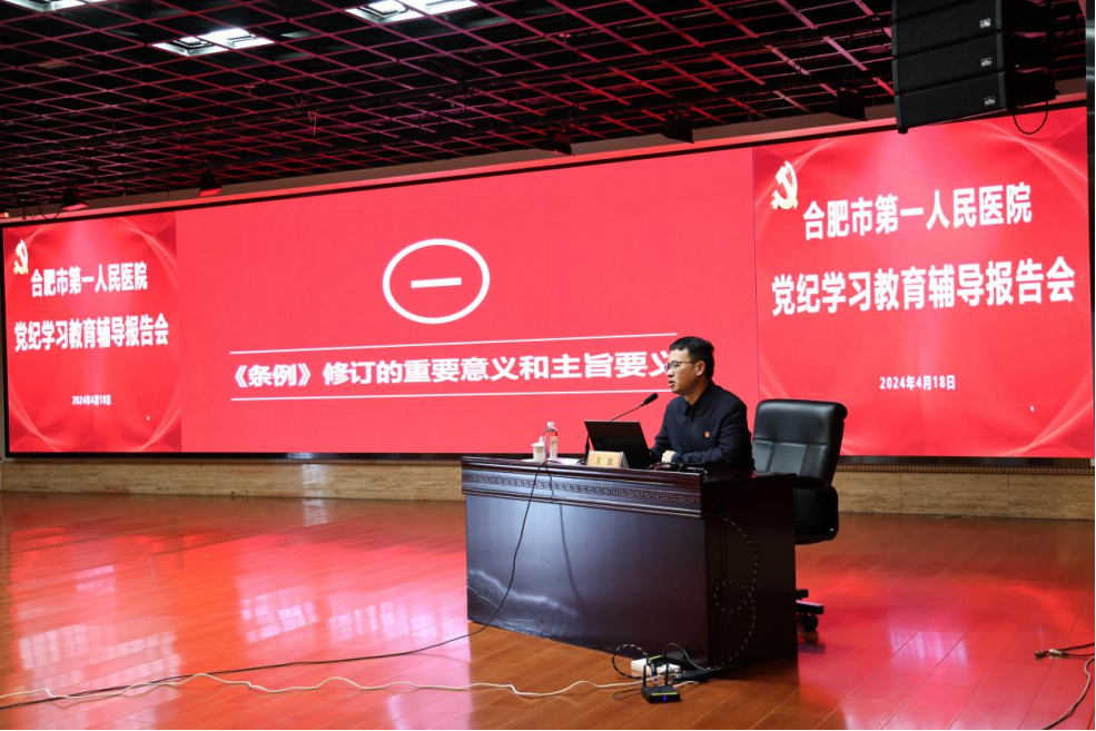 4月18日下午,我院在滨湖院区16楼会议中心举行党纪学习教育辅导报告会。会议邀请省委党校(安徽行政学院)党建部副教授、法学博士方堃就新修订的《中国共产党纪律处分条例》(以下简称《条例》)作专题辅导报告。院领导班子、中层干部、支部书记、科主任和护士长参会。会议由纪委书记靳莉娜主持。