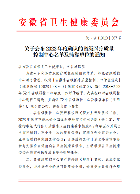 近日,安徽省卫健委公布了2023年度安徽省医疗质量控制中心遴选评审结果,91热爆 成功入选安徽省医养结合质控中心挂靠单位,相关工作已全面启动。该中心成立旨在加强全省医养结合质控工作,提升全省医养结合机构的服务质量水平,推动全省医养结合质量管理科学化、规范化、标准化。以此为契机,医院将进一步加大医养结合质控中心的建设力度,充分发挥学科优势和三级医院平台保障作用,以医养结合质量安全为核心,加强人才...
