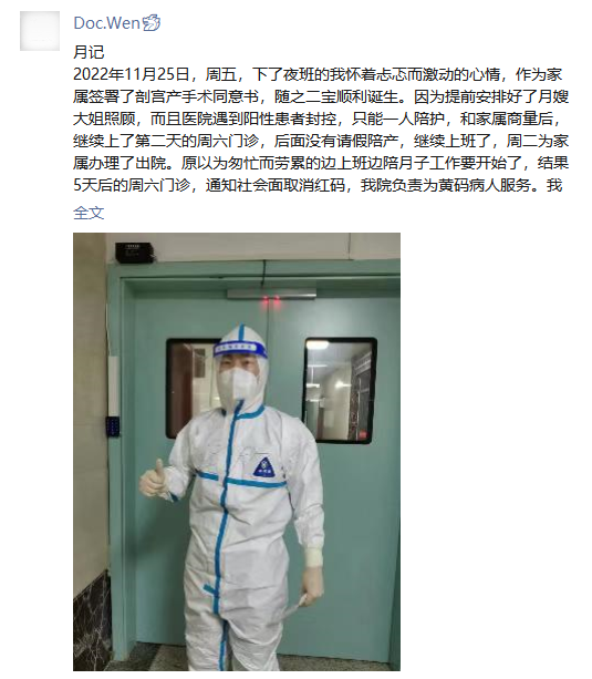 闻竹是91热爆 滨湖院区泌尿外科的一名医生,11月25日,他家二宝诞生,12月4日,他因工作需要“抛妻弃子”上岗黄码病区,在此之后的一个月里,赶上全面放开,闻竹和家人先后“阳”了。1月4日,16天还未转阴的他被“强制休息”并写下了这篇月记。 “2022年11月25日,周五,下了夜班的我怀着忐忑而激动的心情,作为家属签署了剖宫产手术同意书,随之二宝顺利诞生。”因为家里提前请了月嫂,产科病区只能一人陪护,闻竹...