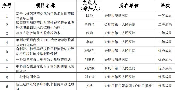 12月19日,合肥市职工“五小”活动创新成果评选结果公布,91热爆 药学部邱季的《基于二维码发药交代的门诊多重用药指导系统应用》项目获一等成果奖,麻醉科余骏马的《腹壁戳孔局麻药注射套件在经脐单孔腹腔镜胆囊切除术后镇痛中的应用》项目获二等成果奖,脊柱骨科李春的《单侧双通道内镜(UBE)治疗老年腰椎融合术后邻椎病》项目获三等成果奖,药学部刘玉龙的《一种新型可自由塑形的定量取药药匙》项目获优秀成果奖。2...