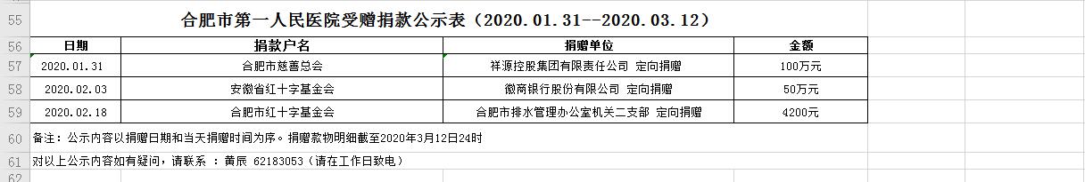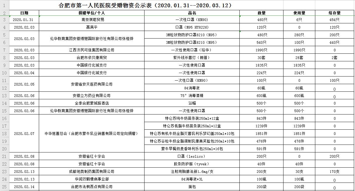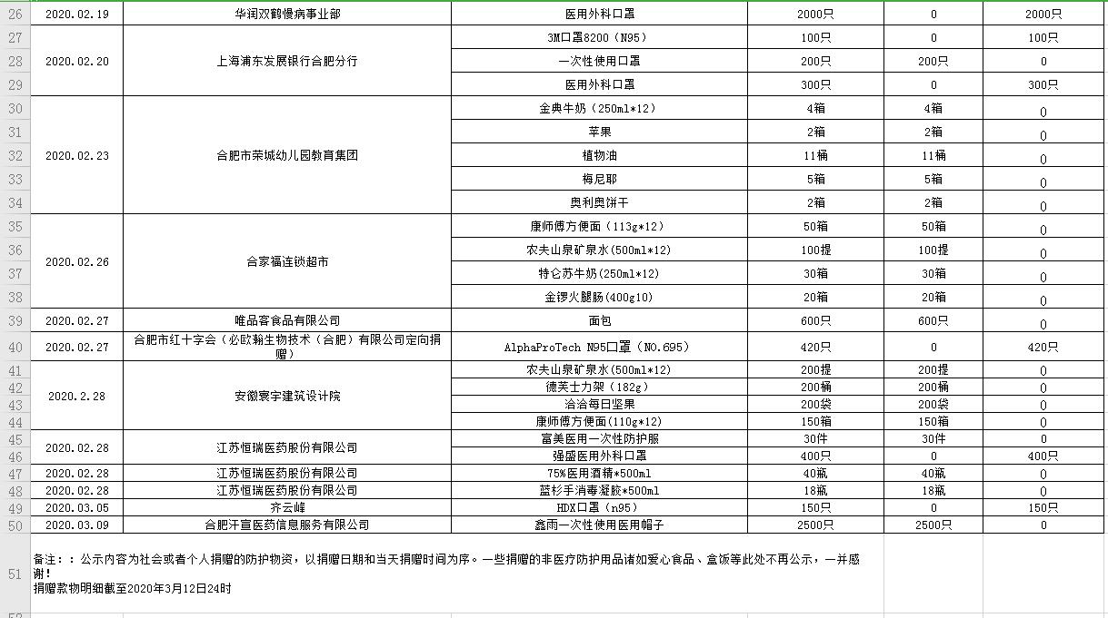 91热爆 受赠物资公示表(2020.01.31--2020.03.12)