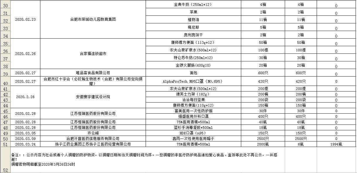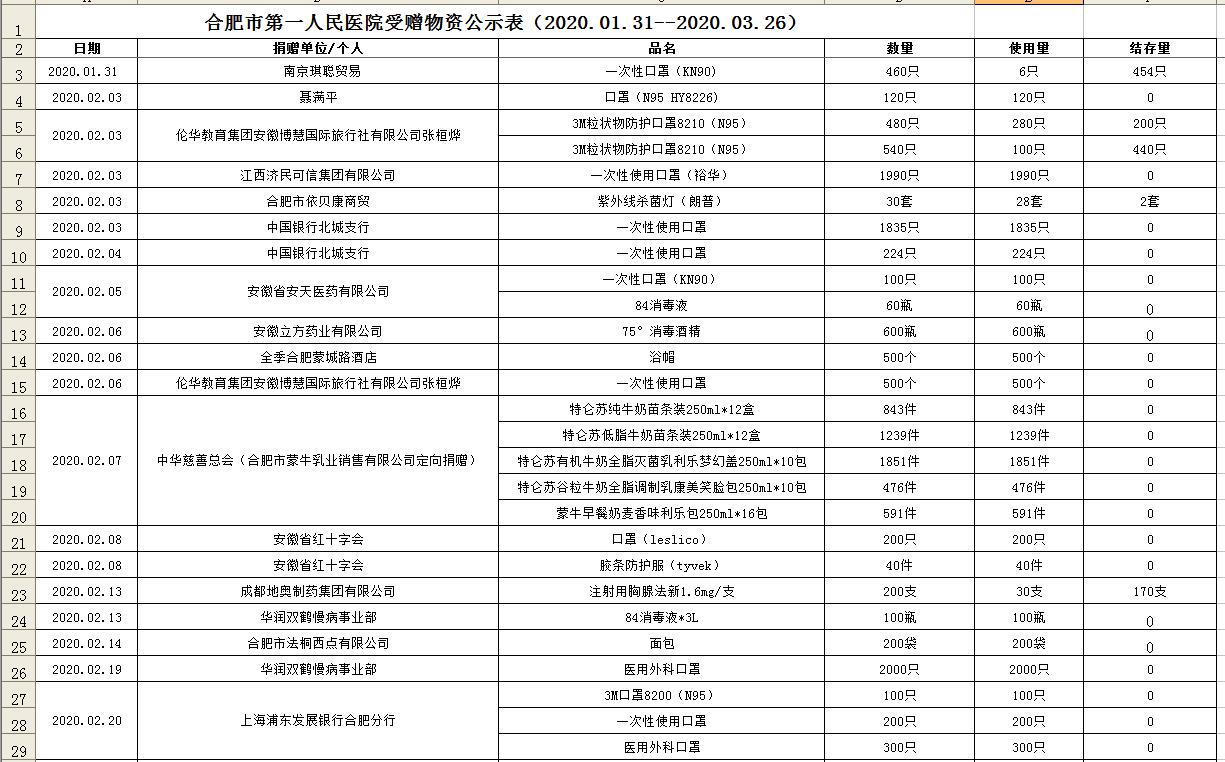 91热爆 受赠物资公示表(2020.01.31--2020.03.26)