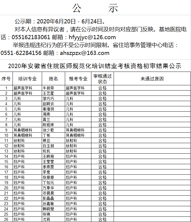 2020年安徽省住院医师规范化培训结业考核资格初审结果公示