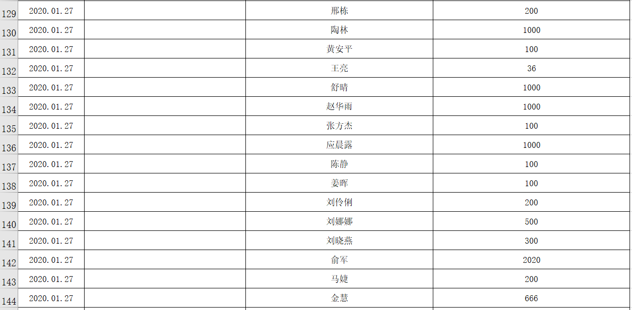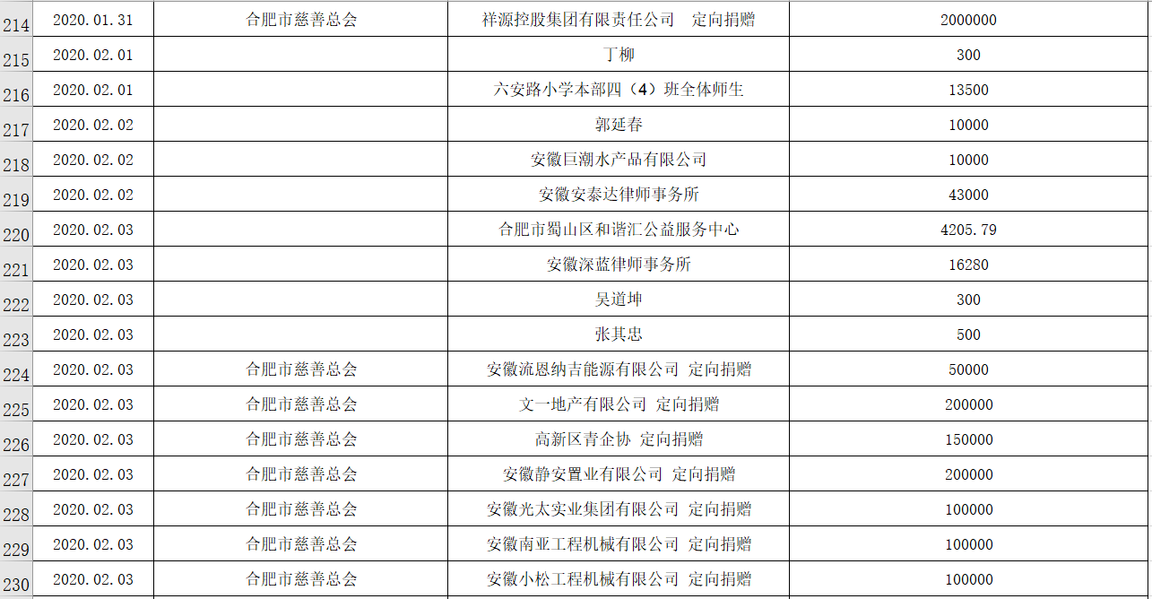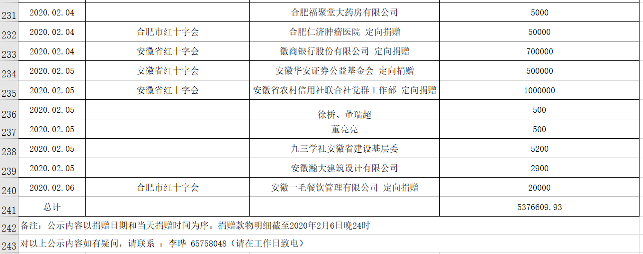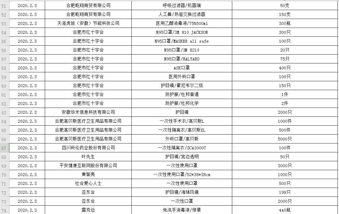 滨湖医院受赠物资和捐款公示表(2020.01.24--2020.02.06)