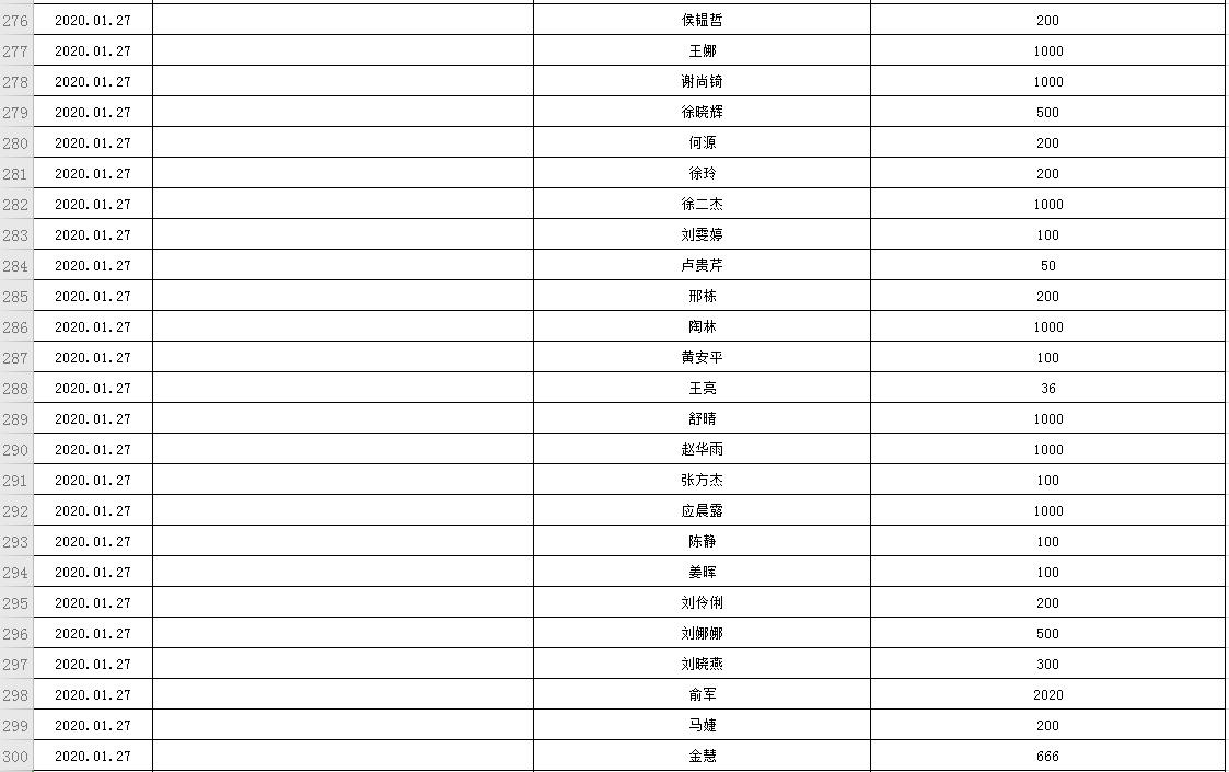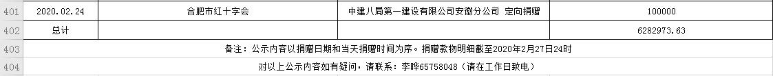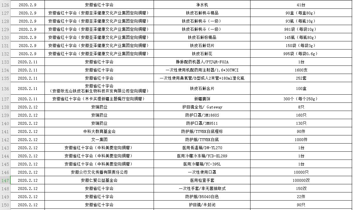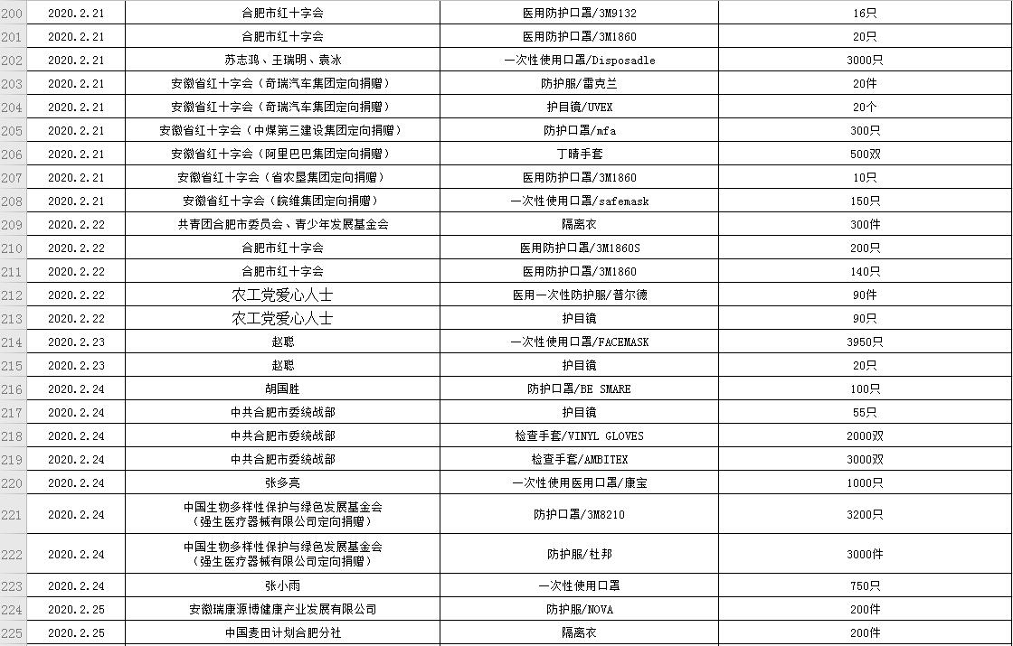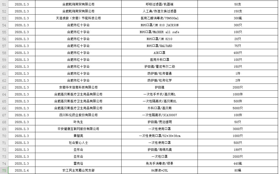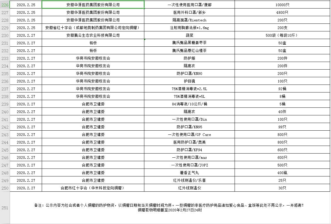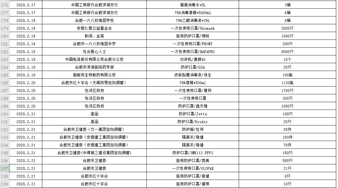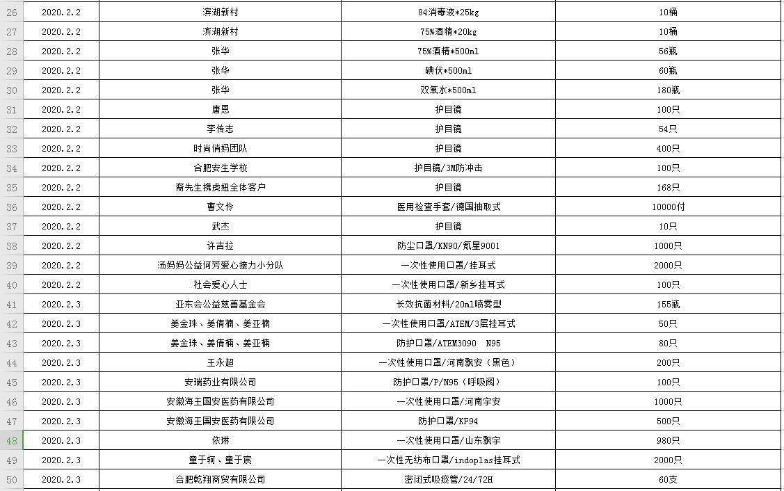 滨湖医院受赠物资公示表(2020.01.24--2020.02.27)