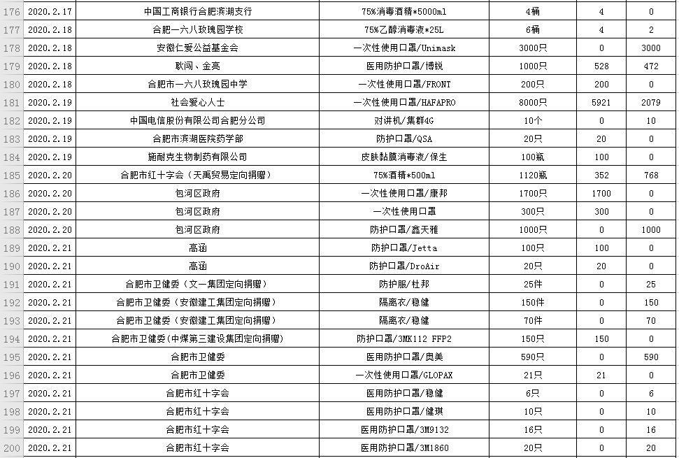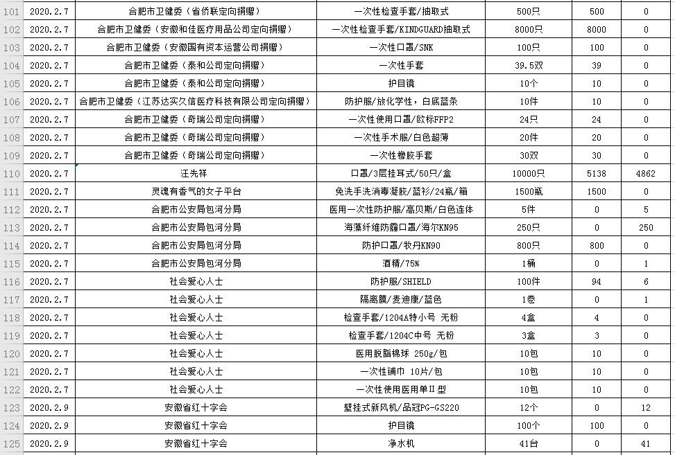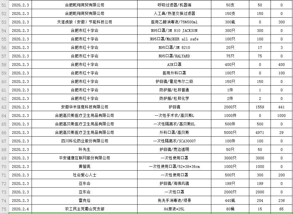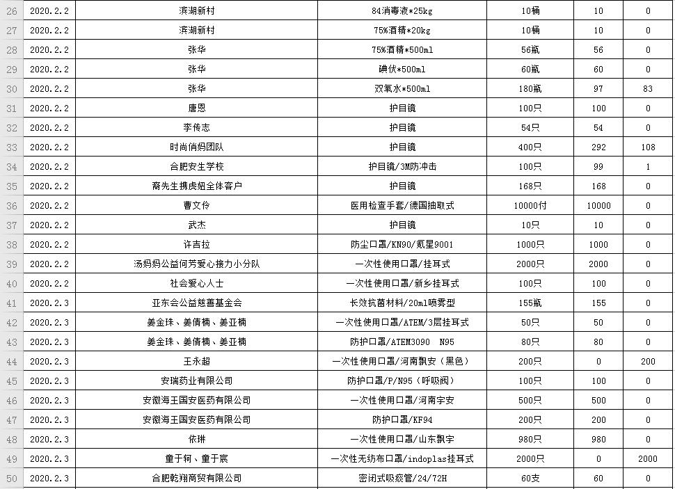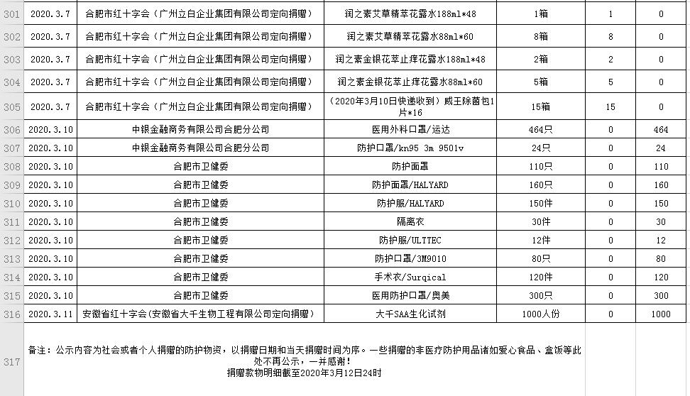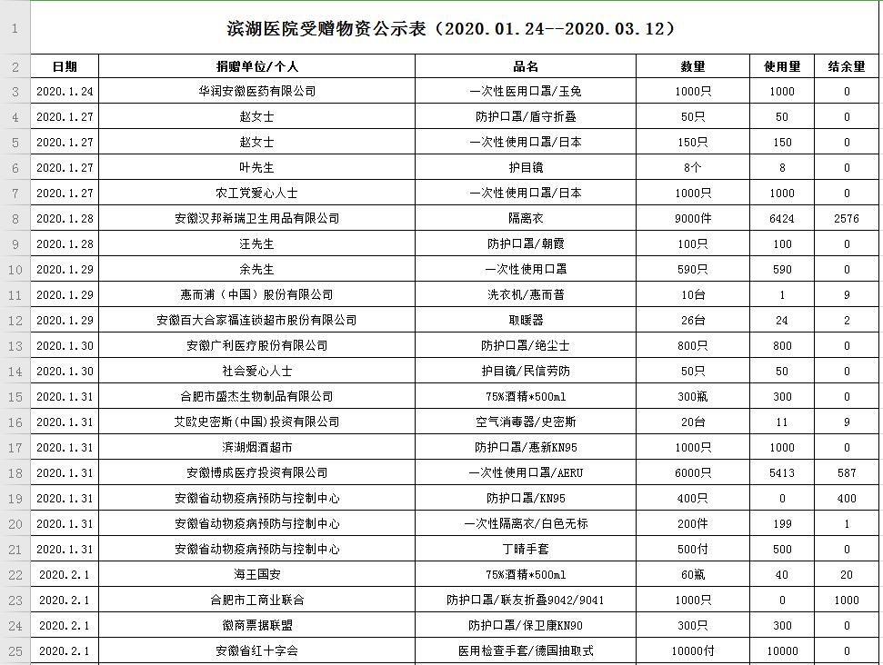 滨湖医院受赠物资公示表(2020.01.24--2020.03.12)