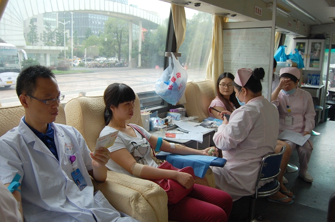 8月19日及8月21日两日我院分别在院本部及滨湖医院展开了2015年无偿献血活动。献血过程中,大家纷纷填表、验血、献血……秩序井然。献血队伍中,有第一次参加献血的新人,也有多次献血的“老面孔”。有刚从繁忙科室中赶来献血的,也有当日休假也专门赶回投入献血队伍的。而大部分医务人员献完血休息一会儿,又匆匆回到了各自岗位上。献血现场热情高涨,热情的氛围感染着现场的每一个人,大家顺利完成了义务献血工作。