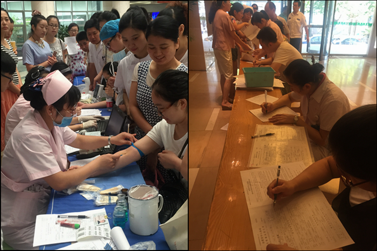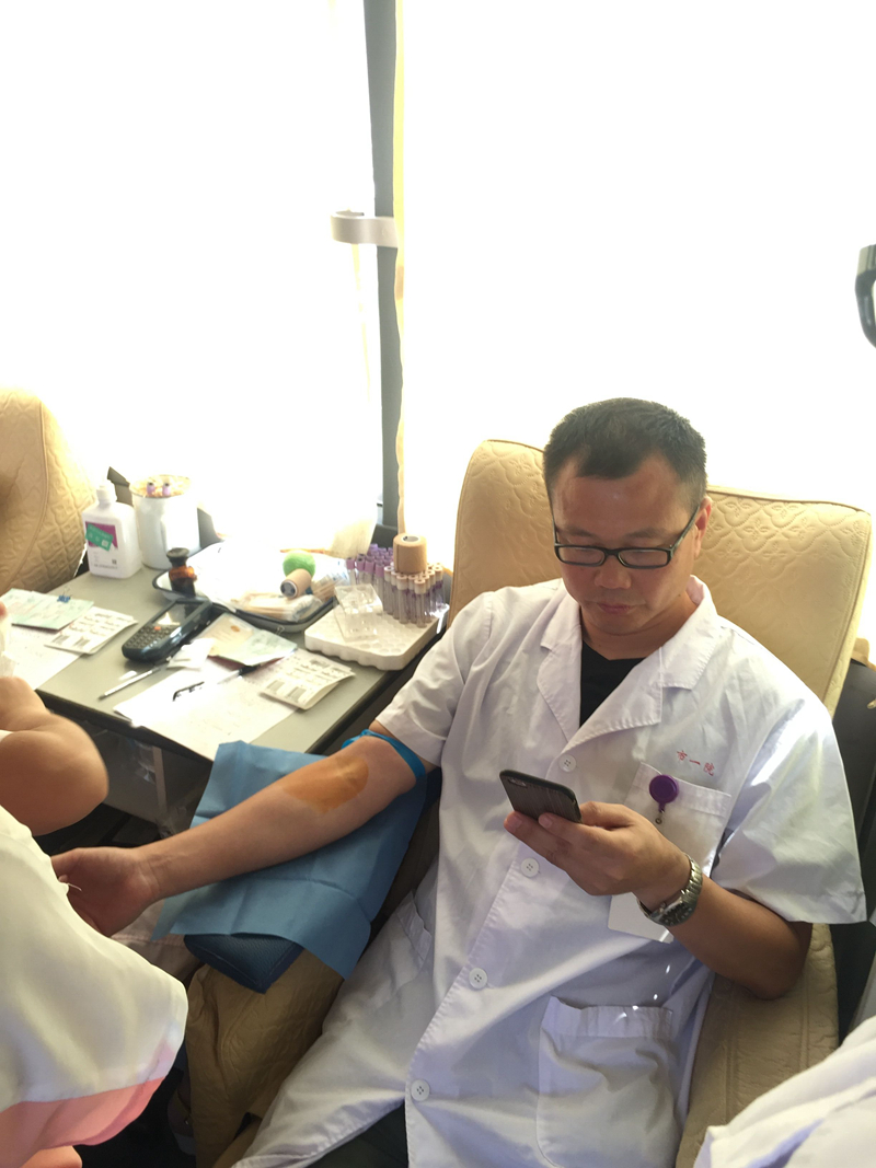 三天时间里,合肥市第一人民集团医院各个院区的职工积极配合着工作人员完成填写表格、测量血压和验血等献血前准备工作。很多科室主任、护士长纷纷带头献出自己的一份热血,献血队伍中有身先士卒的副院长;有刚下门诊匆匆赶到的科主任;有刚下夜班还没来得及休息的医护人员;有结伴而行的献血夫妻档;有多次献血的老职工;也有初次献血的年轻医护人员。市一院副院长吴冬雷亲自带头参加献血,他说:“作为医务工作者,我们更加明白血液在临床的重要性,积极献血、奉献爱心,我们医护人员应当作为表率。”市一院本部献血当天适逢七夕节,不少医护人员都说:“今年的七夕过的特别有意义